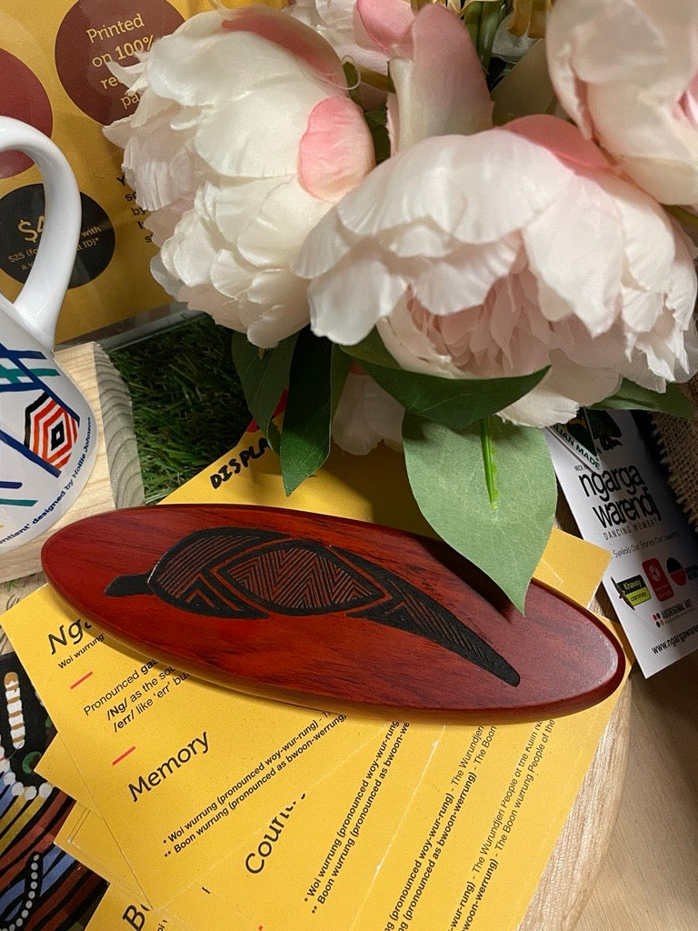 Celebrate Indigenous culture with the Rosewood Oval Pen Set by Ngarga Warendj. This elegant gift set features a premium rollerball pen housed in a rosewood case, beautifully engraved with a gum leaf motif. The base of the case shares the story behind Ngarga Warendj and RMIT’s commitment to First Nations recognition. Perfect for those who value cultural meaning and timeless design.
