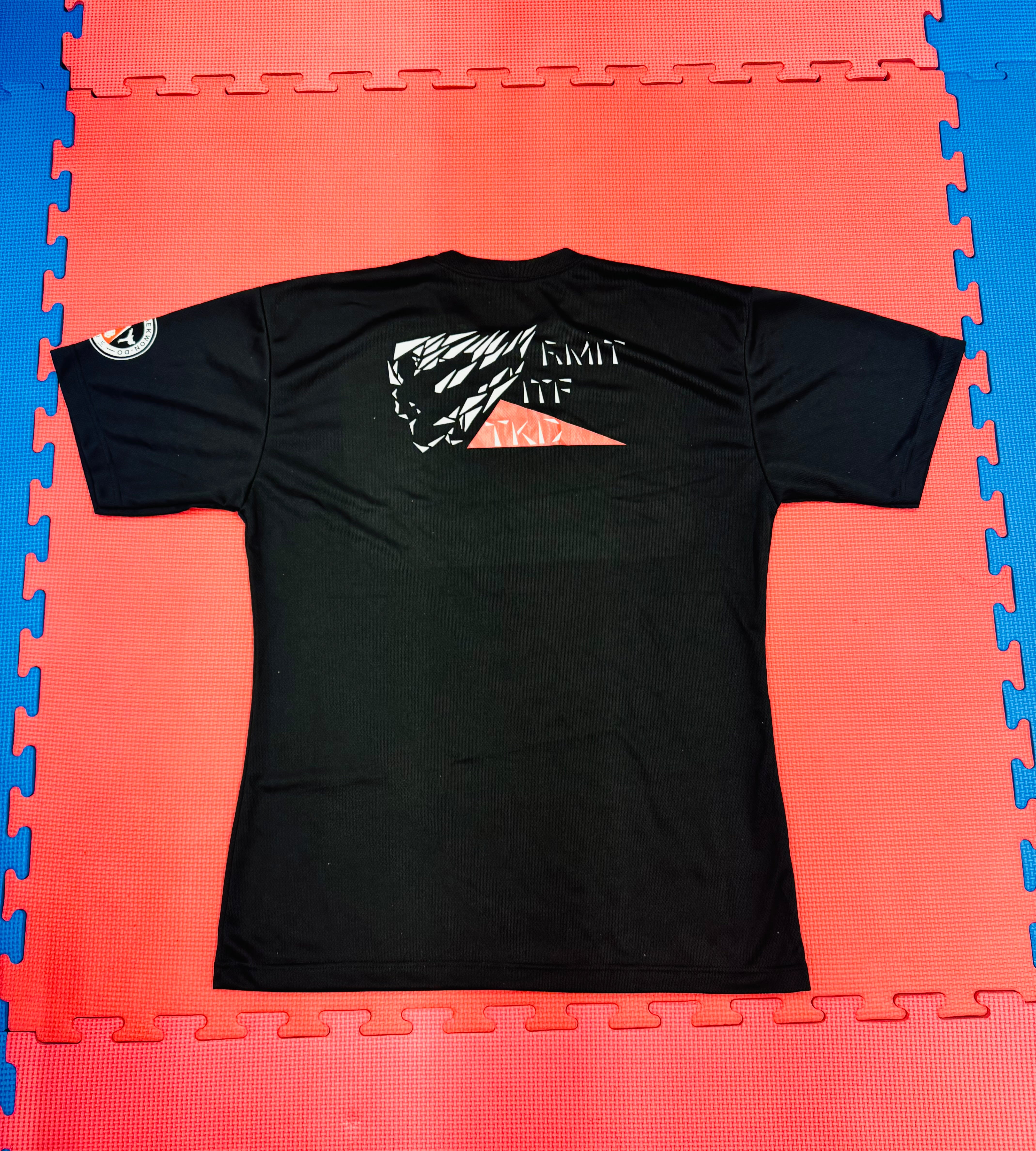 Represent the RMIT ITF Taekwondo club in black. Fit for training and exercise.