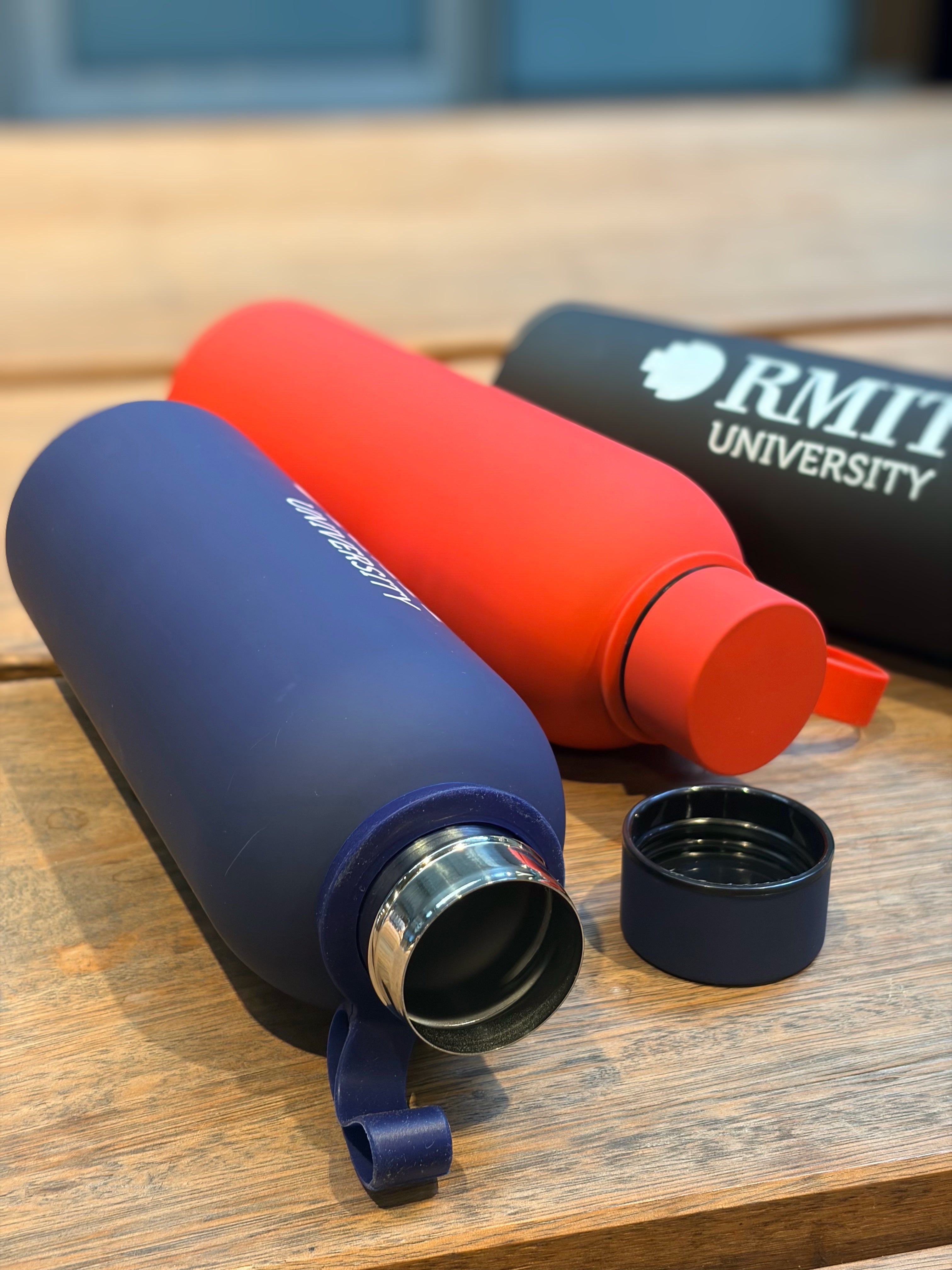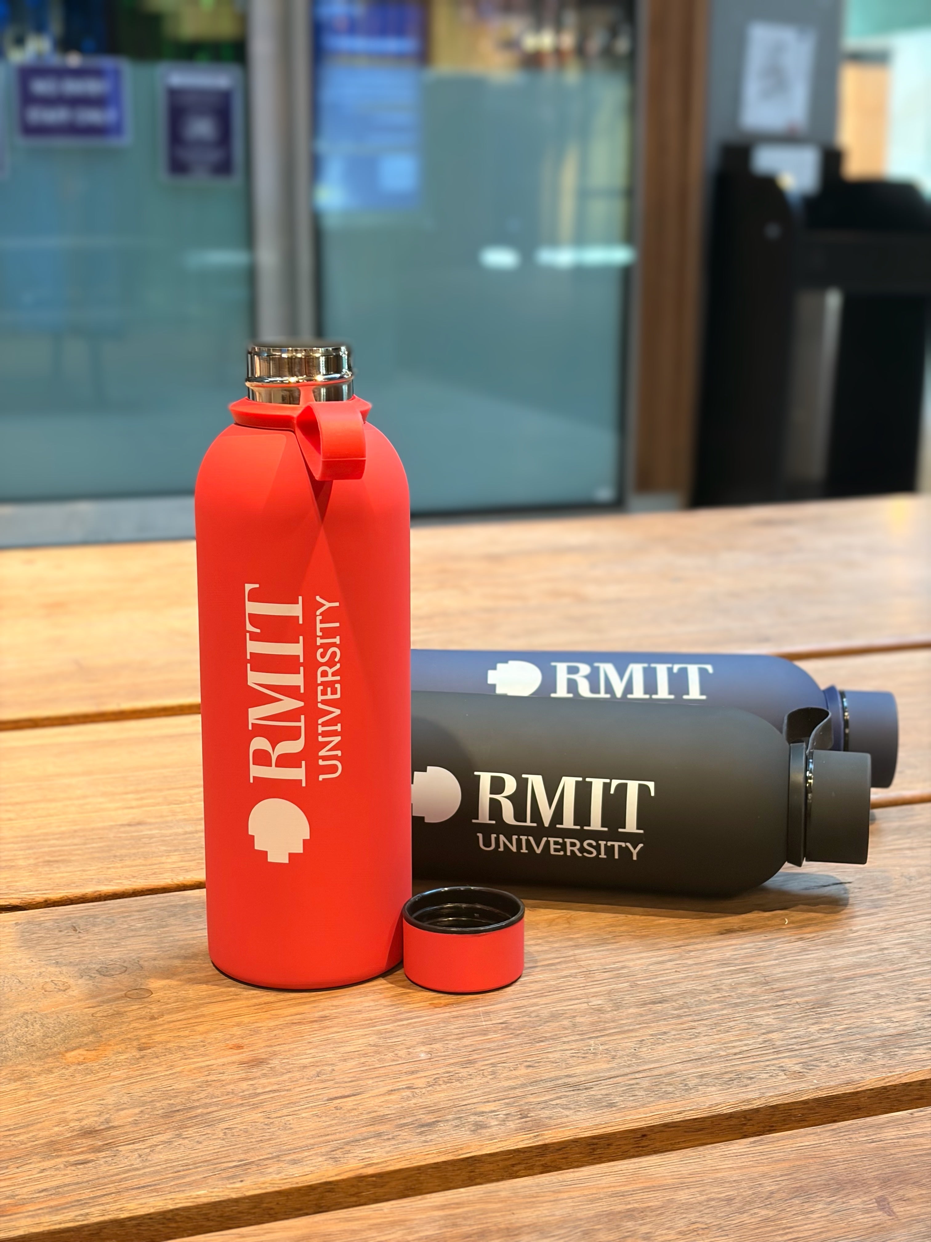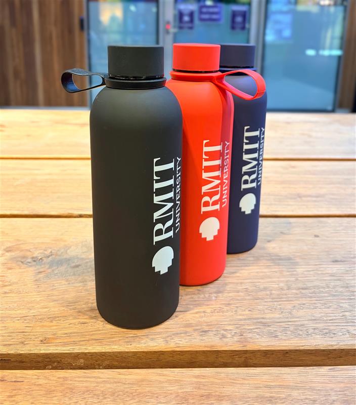 Available in three classic RMIT colours, black, red, and navy, each bottle features a secure twist-top lid with an integrated carry loop, making it the perfect companion for classes, the gym, or your commute. Practical, modern, and full of school spirit.